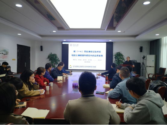作题为“碳(13, 14C)同位素标记技术在稻田土壤碳循环研究中的应用案例”的学术报告,报告由学院副院长张进教授主持,生态环境研究院教师、研究生等30余人参加了报告会。