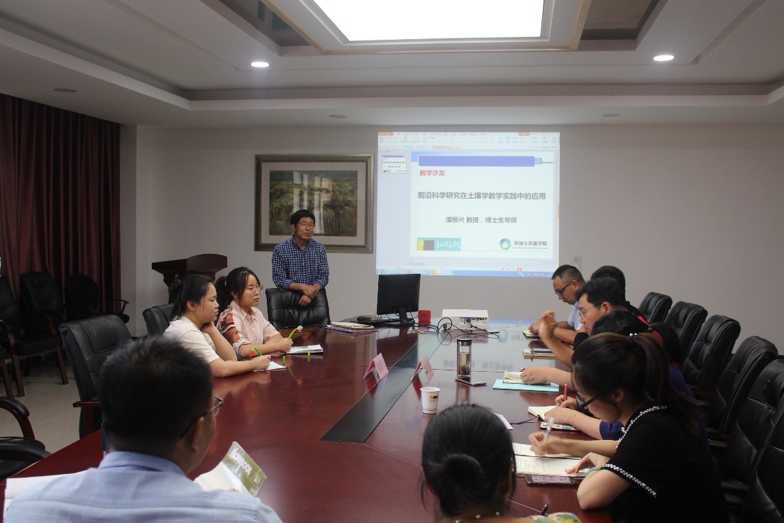 潘根兴教授作为南京农业大学土壤学重点学科带头人,长期致力于土壤环境、土壤微生物、生物质炭化技术与产业化应用的研究。报告会上,潘教授结合自己对学科领域充分的认识及思考,由浅及深、由表入里地讲述了农业资源与环境学科的内涵、发展背景、现状和需求,总结了学科的发展特点和社会责任,明确了“农业、农村、农民和谐发展,健康、公平、可持续社会”及“从农村到全球”的发展方向,具有宏观的指导意义,令现场师生受益匪浅。报告最后,师生们就学科前沿进行了热烈地交流讨论,对学科有了更深刻的认识,并开拓了科研道路。