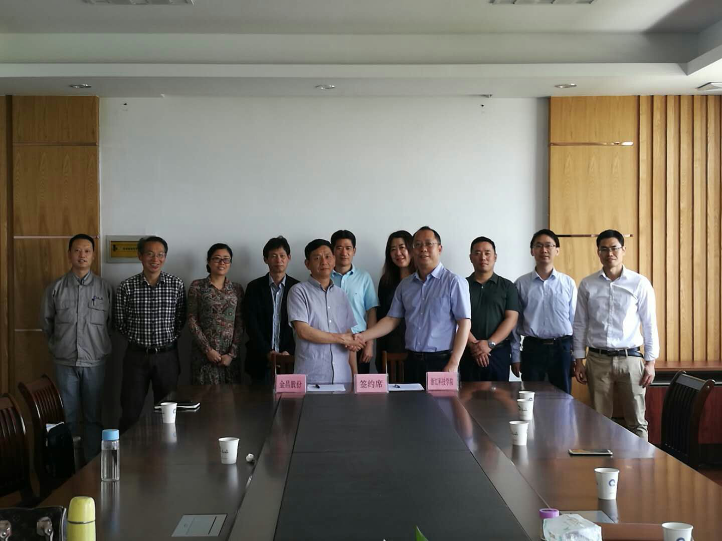 浙江金昌特种纸股份有限公司董事长张求荣先生介绍了该单位的基本情况,并重点强调公司与浙江科技学院轻化工程系的合作基础,就校企合作方式、产学研合作的主攻方向、合作内容等提出了合作的思路,在进行了讨论和交换意见之后,与浙江科技学院环资学院院长沙力争教授签订《浙江金昌特种纸股份有限公司/浙江科技学院战略合作协议》。