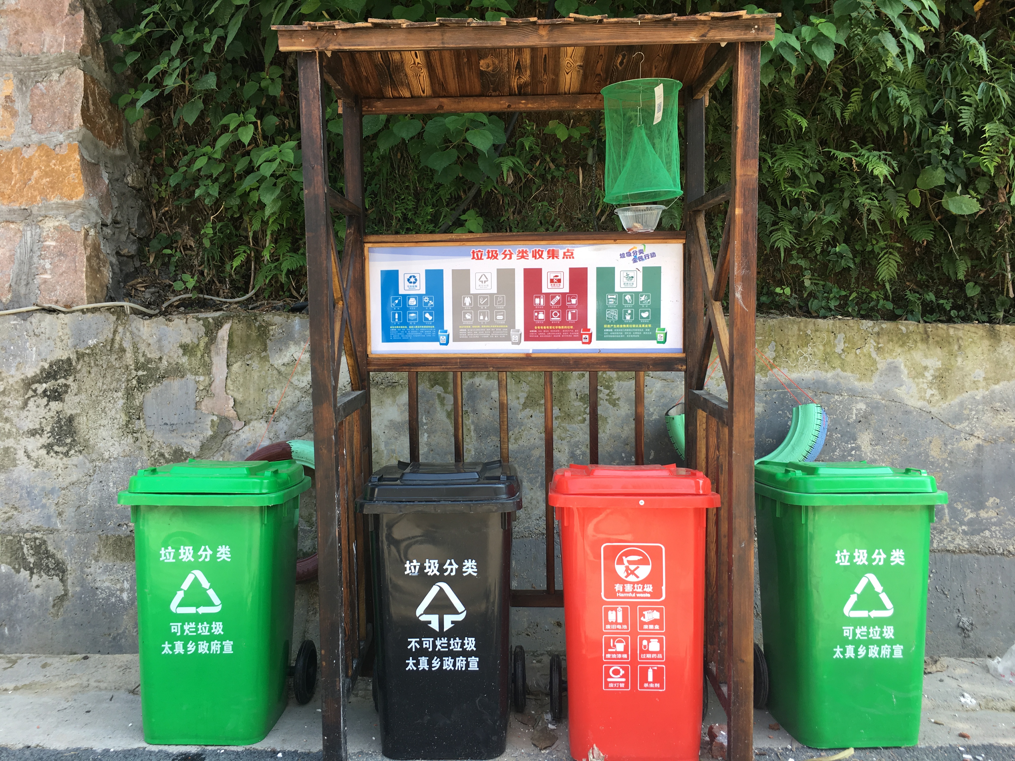 刚到太真乡的时候,实践团员们便被乡中山清水秀的风景所吸引,走在乡道上,统一规划的房屋整齐排列,白墙黑瓦,显得格外素雅。在参观过程中,实践团员们注意到,乡道旁的垃圾桶文字说明区别于以往的“可回收”与“不可回收”,换成了“可烂”和“不可烂”,如此“接地气”的称呼让实践团员们一阵惊奇,后来经询问才了解到,这是为了方便居民更容易实现垃圾分类,如今的太真乡,老年人口居多,想要推进垃圾分类管理难度较大,换成大家都能理解的文字,会极大程度的推进环境治理工作。