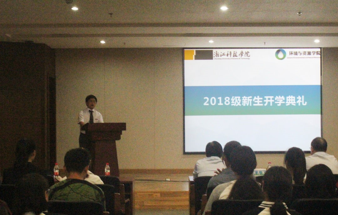 2018级新生开学典礼于安吉校区图书馆4楼报告厅隆重举行。环资学院院长沙力争、副院长方程冉、副院长胡志军、日本筑波大学江前敏晴教授、轻化工程系主任张学金、包装工程系主任陈文革出席本次典礼。新生班主任、全体辅导员、助班及教师代表、校友代表、学生代表、全体2018级新生等参加典礼。开学典礼由学院副院长胡志军主持。