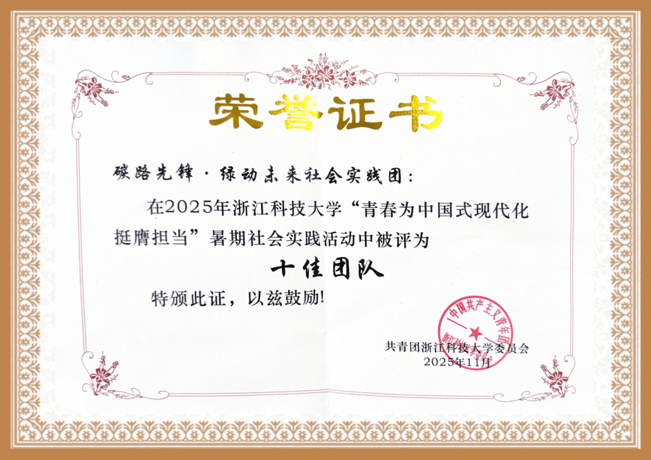 “碳路先锋”暑期社会实践团凭借特色鲜明的实践路径、成果丰硕的育人实效,在全校122支参赛团队中崭露头角,成功斩获校“十佳实践团队”荣誉,指导老师曾嵘获评“优秀指导教师”。