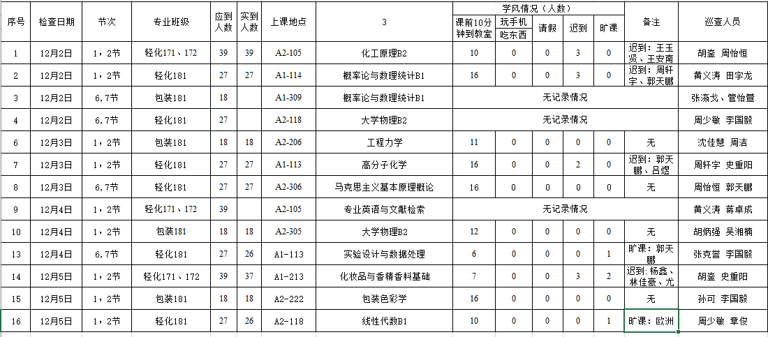 轻化181,马克思主义基本原理概论,老师,应到27人,13.20分到教室16人。学生听课较认真。