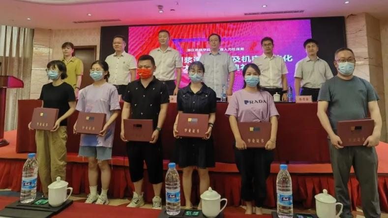 7月6日上午,龙游县2022届制浆造纸技术及机电一体化大专班毕业典礼圆满举行,来自县内16家主导产业企业的69名学员顺利毕业。
