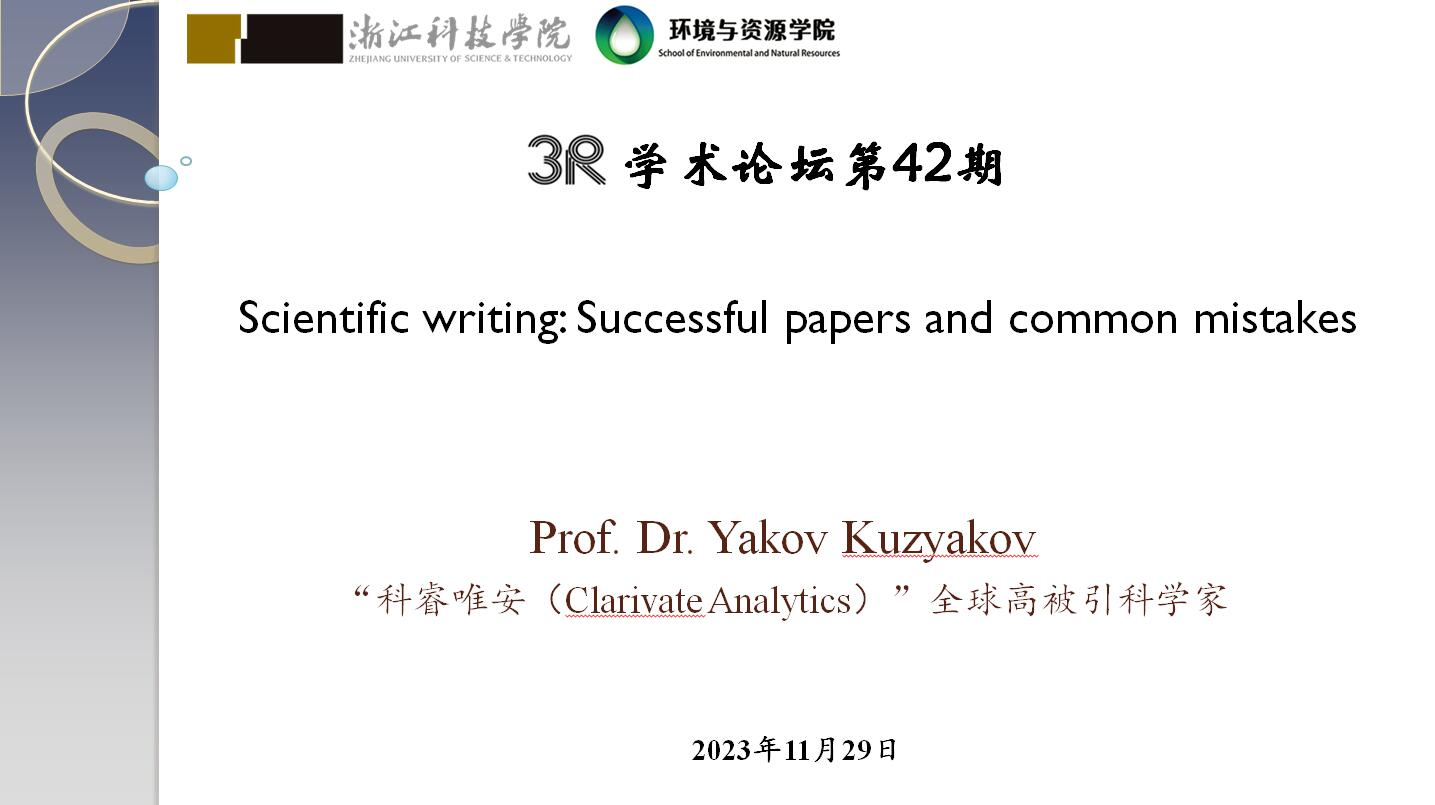 2023年11月29日上午,德国哥廷根大学Yakov Kuzyakov教授来访学院并作题为“Scientific writing: Successful papers and common mistakes”的学术报告,报告会由学院副院长张进教授主持,环境工程系专业教师和研究生等30余人参加并聆听了报告。